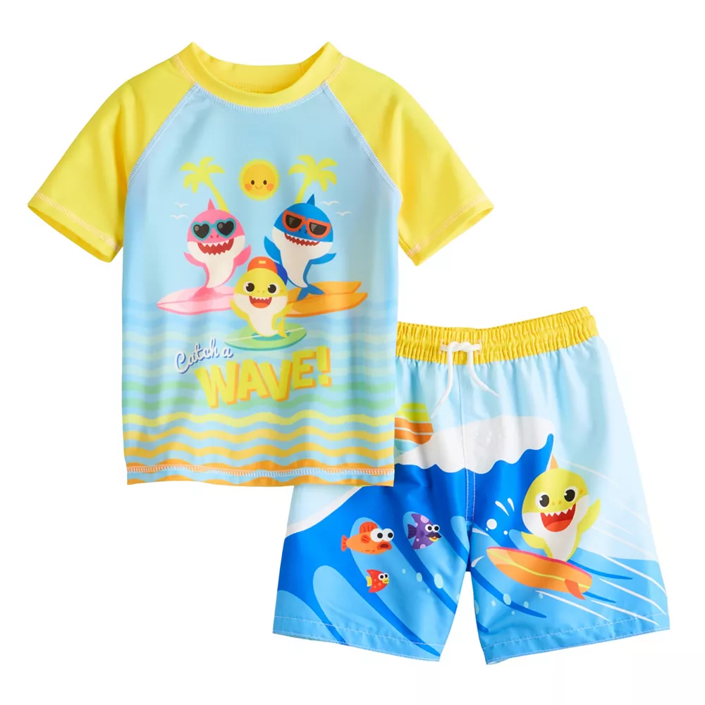 Your little man will be ready for beach day fun in this baby boys’ Baby Shark rashguard and swim trunks swimsuit set.