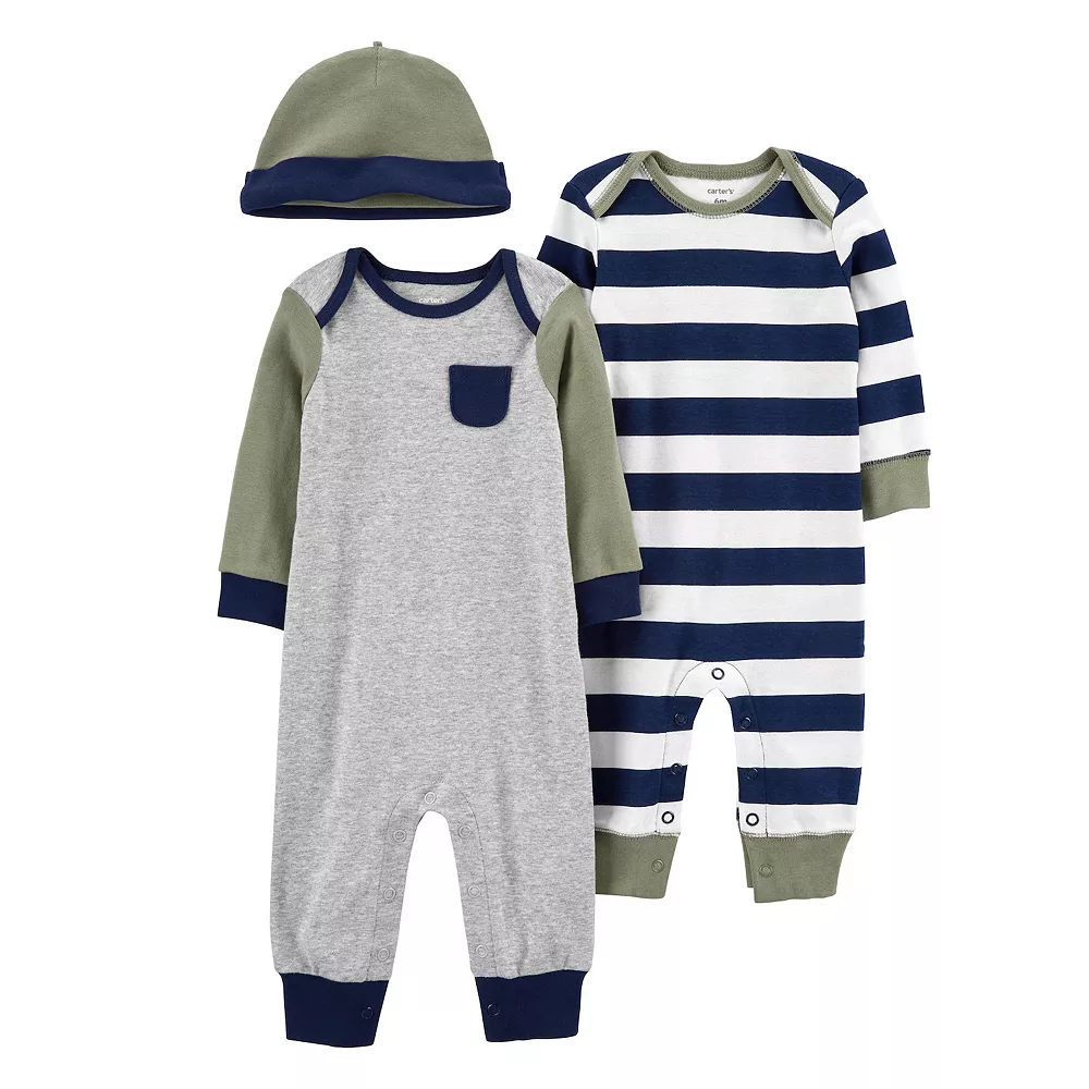 Your little one will look adorable in this baby Carter’s jumpsuit and cap set.