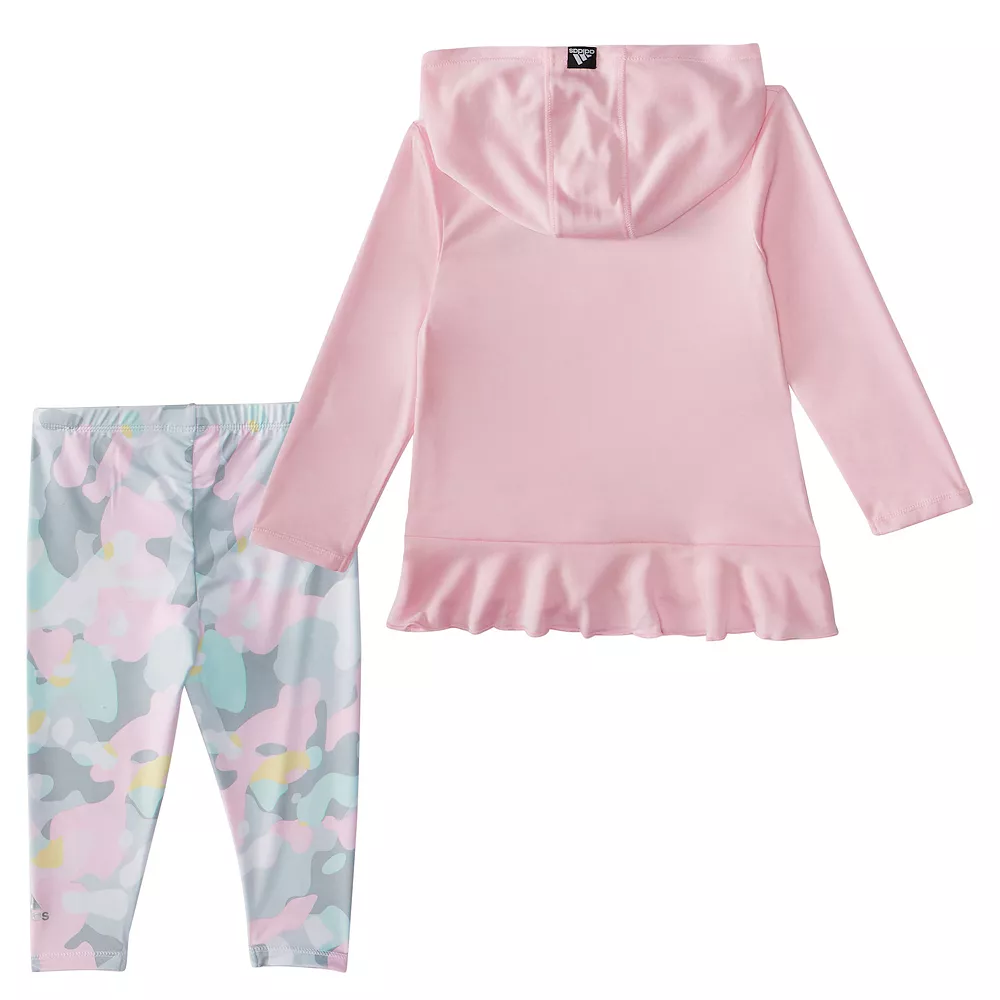 With its hooded shimmer graphic tee and watercolor camo print leggings, this baby girls’ ensemble from adidas will keep your little lady looking sweet.