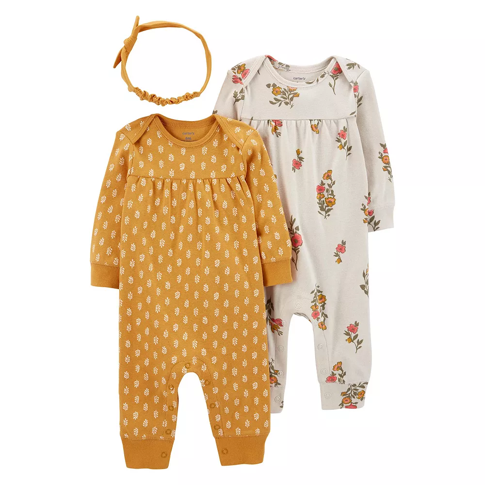 Your little one will look adorable in this baby Carter’s jumpsuit and headwrap set.