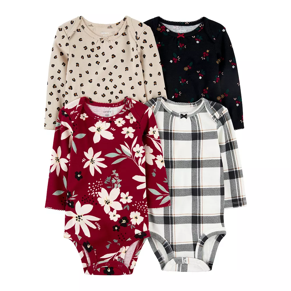 She’ll be sure to always look festive with this four pack of adorable baby girls’ holiday bodysuits from Carter’s.