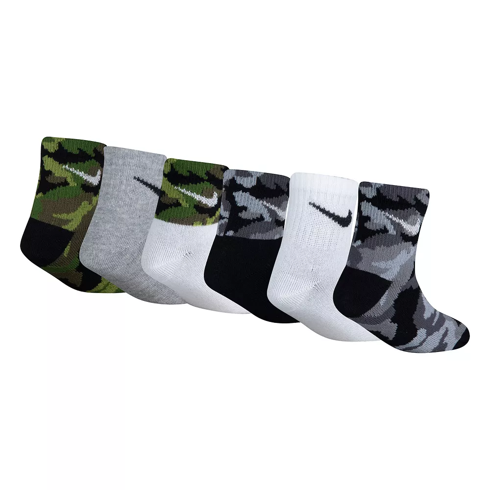 These boys’ Nike socks feature a camouflaged pattern and ankle cut.