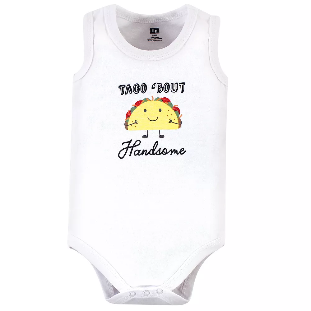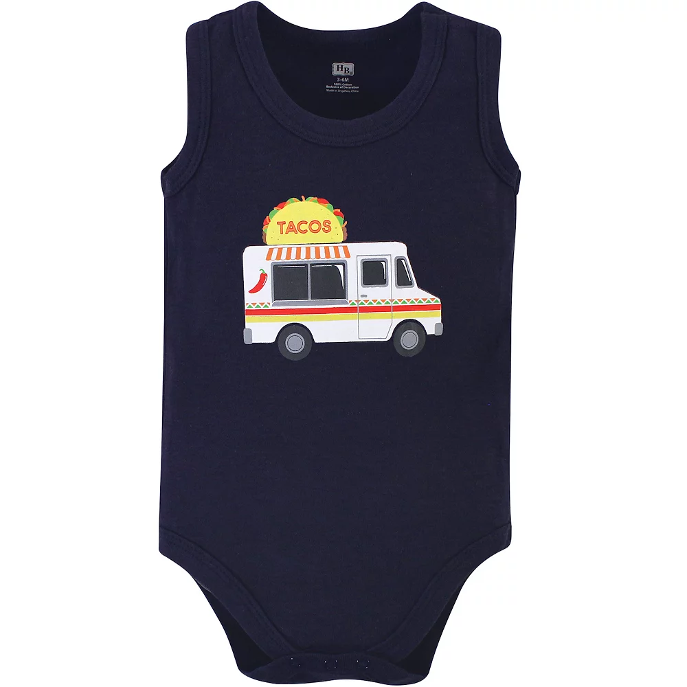 Hudson Baby sleeveless bodysuits are an essential part of baby’s wardrobe. Our bodysuits feature adorable prints, embroideries, stripes and solids and provide a comfortable base layer that’s great for pairing with pants, shorts, or even wearing under outfits. Our bodysuits are comfortable and cozy for all-day, everyday wear for your little one. Hudson Baby Infant Boy Cotton Sleeveless Bodysuits 5pk, Taco Truck is a great baby essentials set for your little one.