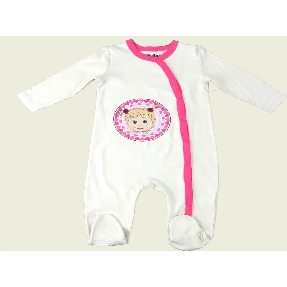 - FUN GRAPHIC: Your child will love this adorable coverall that features a beautiful digital graphic printed on the front. On this piece is an image of Masha in a circle filled with different shades of pink hearts.