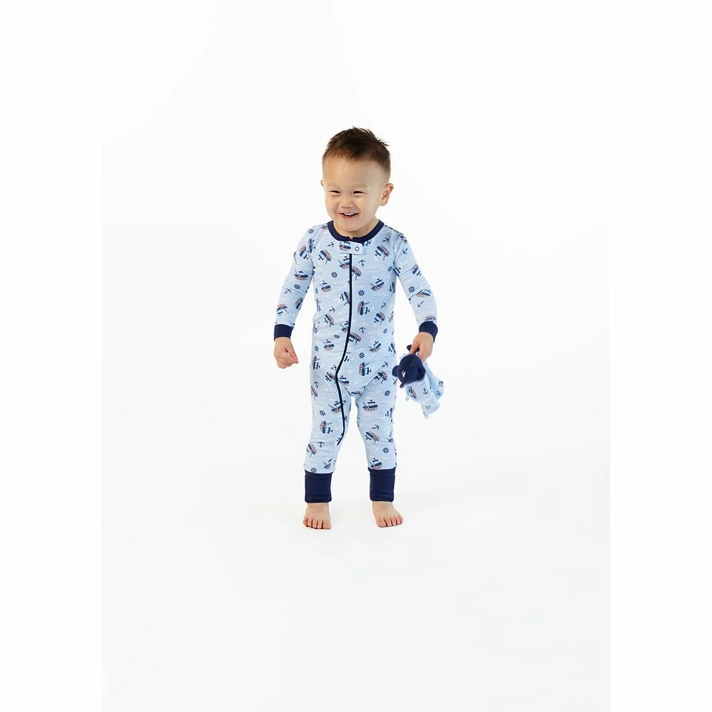 All aboard the dreamland boat! In this super-soft and kind to his delicate skin, jersey coverall pajama, he’ll have no problem escaping to the land of nod. Features a full-length zipper, perfect for those nighttime changes and convertible foot covers for cooler nights. He’ll be ready for Dreamtime adventures with his matching tug boat print baby buddy.