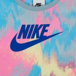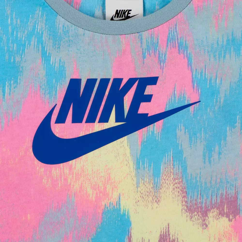 - Top: soft jersey, short sleeves, ribbed crew neck, dropped shoulders, relaxed boxy fit, all-over print, and signature Nike logo at the front.